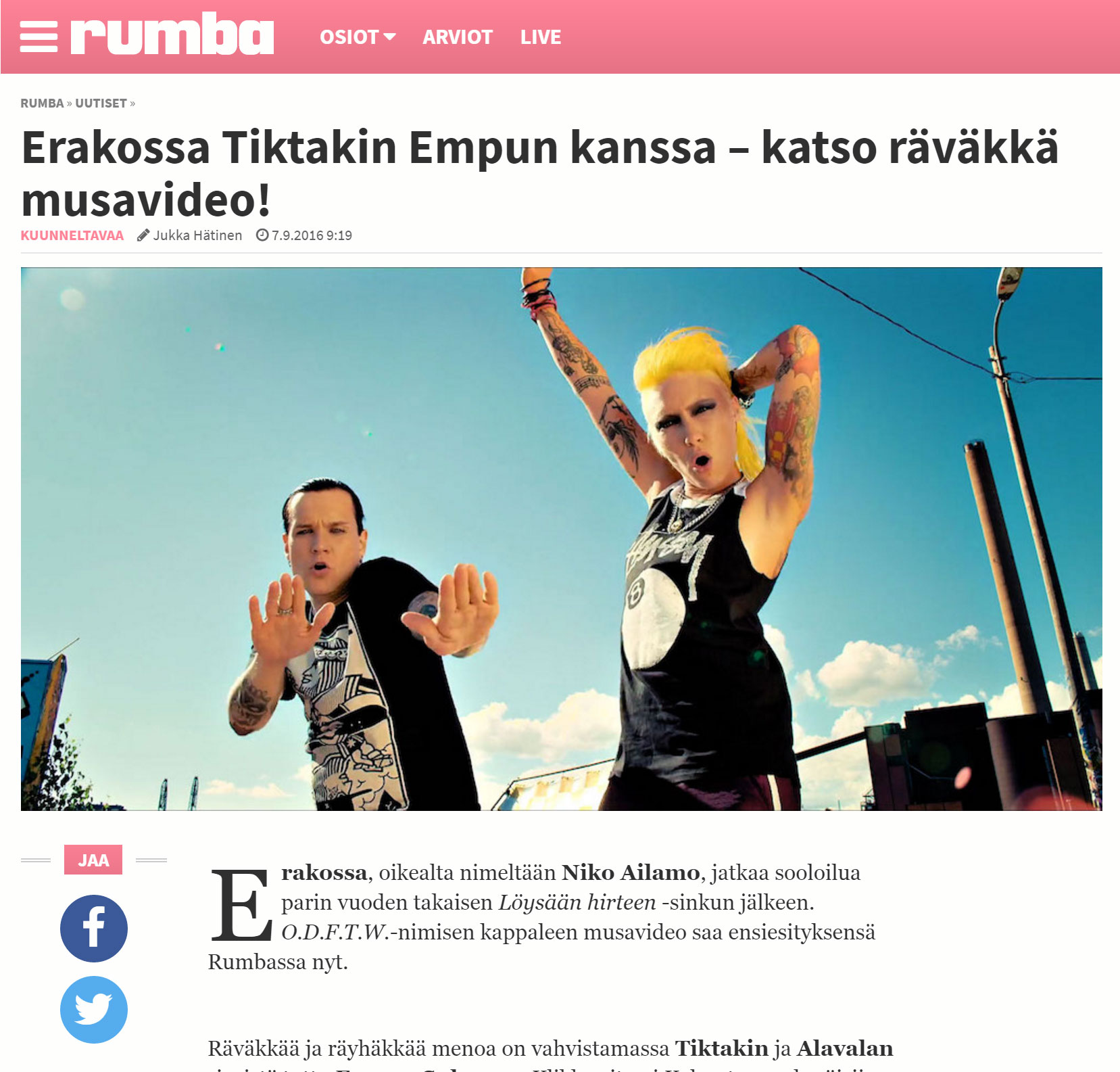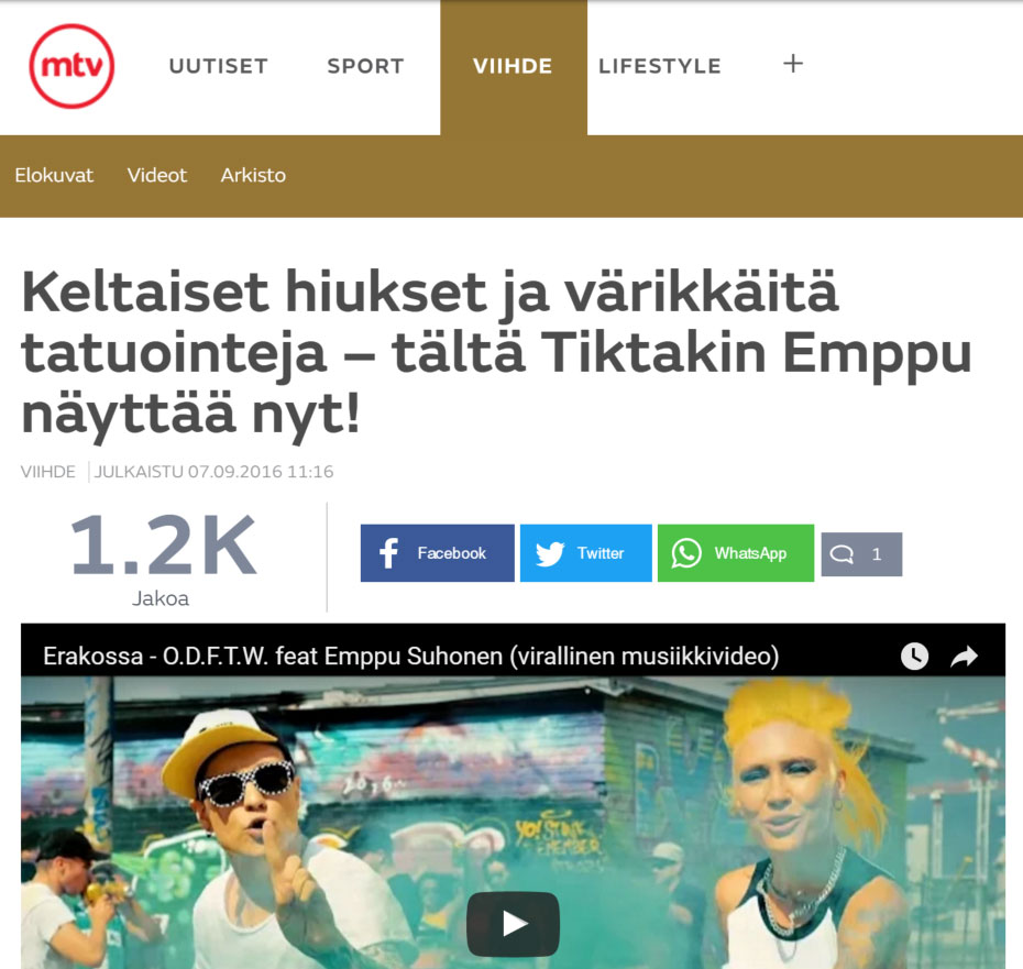 Mistä sä et saa tarpeeksesi? O.D.F.T.W. raidalla on feattaamassa Tiktakista tunnetuksi tullut Emppu Suhonen. Videolla nähdään cameoroolissa lumilautailija Heikki Sorsa, jonka johtama joukkio loihtii videossa maahan massiivisen O.D.F.T.W. symbolin – puolikkaan jalkapallokentän kokoisen hymynaaman. Loistavasti kappaleen tunnelmaa tehostavan videon loihti MVP74, joka on viime aikoina tehty töitä mm. Elastisen ja Mäkin kanssa.